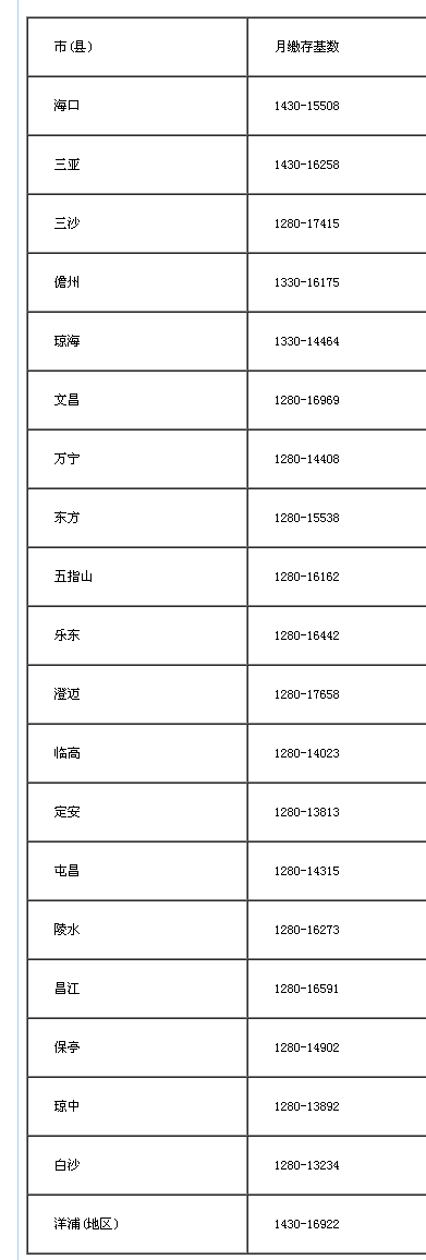 按照《住房公积金办理条例》及《关于住房公积金办理若干具体问题的指点看法》(建金管〔2005〕5号)的相关,根据《海南省人平易近关于调整最低工资尺度的通知》(琼府〔2016〕25号)及省统计局发布的2016年相关正在岗职工年平均工资,2017年度住房公积金缴存基数范畴如下。